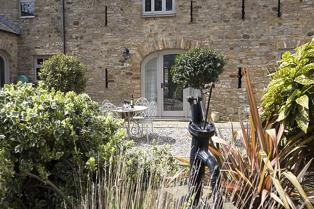 Yes, there is an enclosed garden/patio area where guests can enjoy privacy and outdoor dining, complete with a BBQ and a charming water garden.