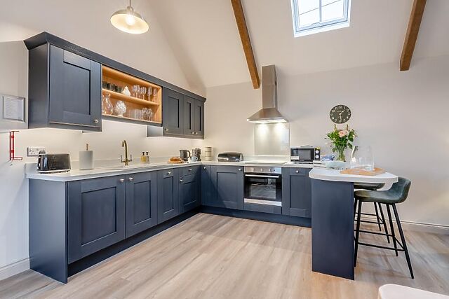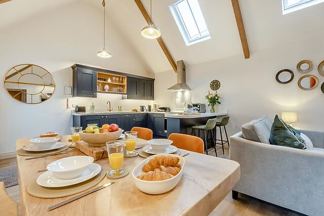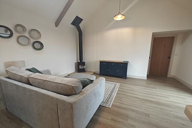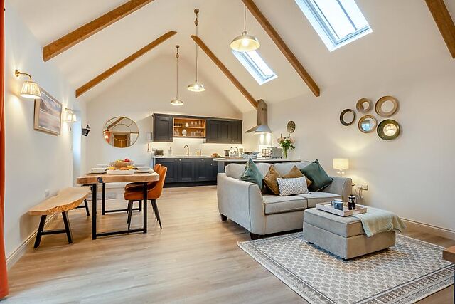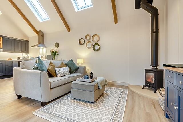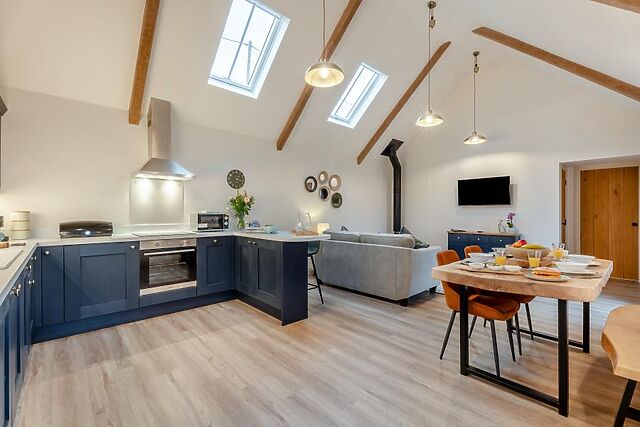 Step inside this one-storey barn conversion and take in the surrounding countryside as you go. Modern design has been cleverly blended with original features including vaulted ceilings and exposed beams, and the open-plan lounge/kitchen/diner is the heart of this retreat.