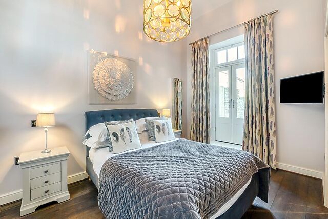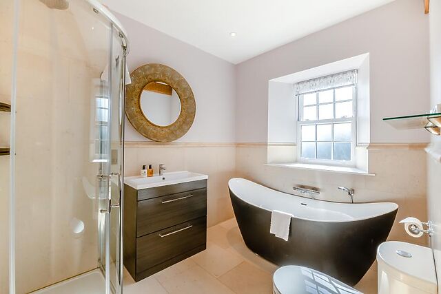 Two double bedrooms with en-suite shower rooms are conveniently located on the ground floor, while upstairs, you’ll find two luxurious super-king bedrooms, both with en-suite bathrooms and separate showers. A fifth bedroom, ideal for families, features a double bed with a single bunk overhead.