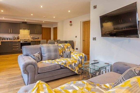 The open-plan living area has two sofas including a high-quality double sofa bed plus a fully equipped kitchen with gas hob, dishwasher and more.