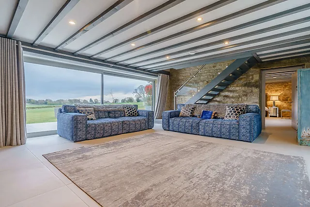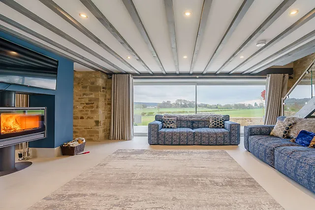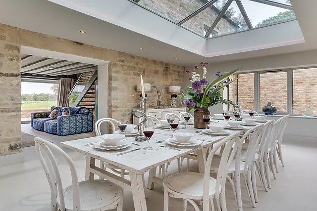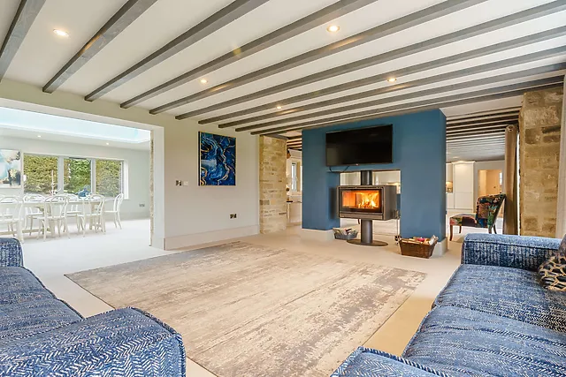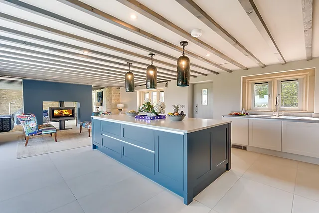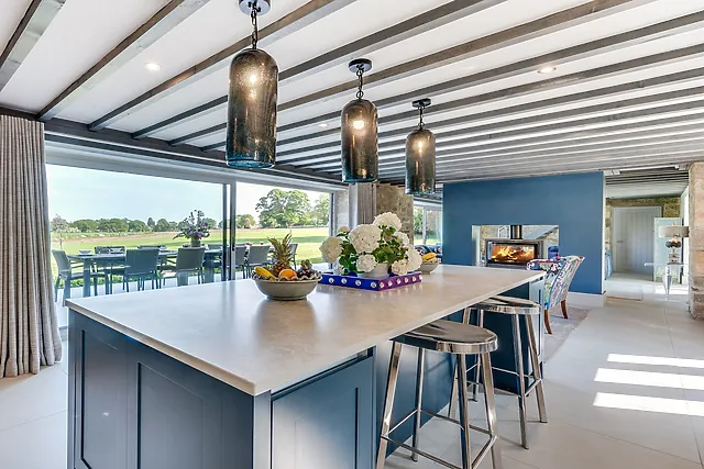 At the heart of the farmhouse is a spacious open-plan living area with a stylish kitchen, where you can cook up a storm with top-of-the-range appliances. The cosy lounge, complete with a dual aspect wood burner, is the ideal spot to unwind.