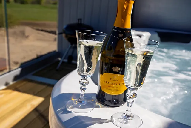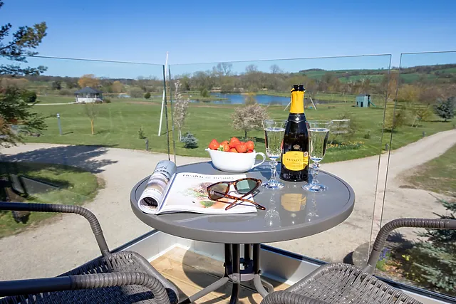 Yes, the property features a private hot tub on the glass-fronted balcony, providing a relaxing experience with stunning views of the countryside.