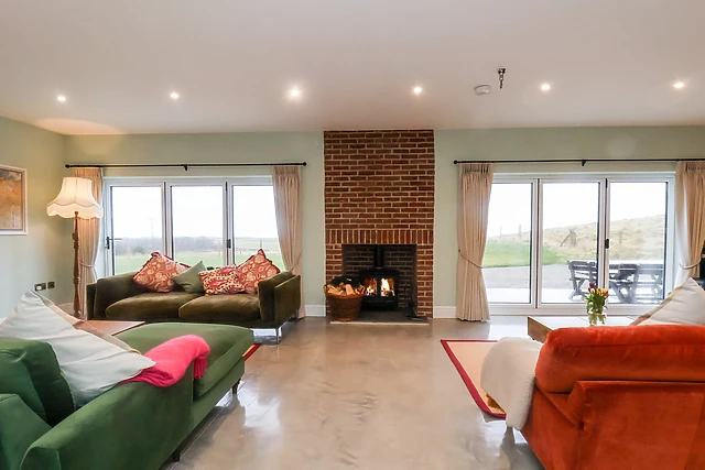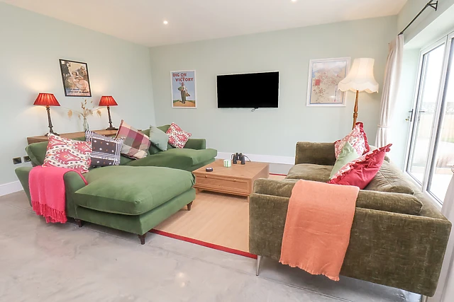 Glass doors take up almost one entire wall and provide spectacular sea views. These lead out to the private garden and patio, while discreet hedging and fencing alongside the property offer complete privacy to our guests.