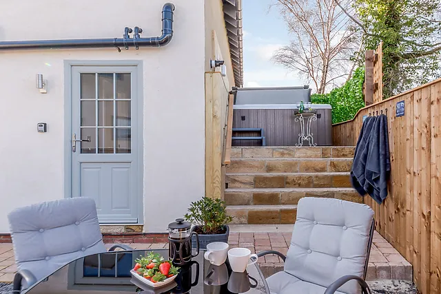 Indulge in the ultimate relaxation with a private hot tub, boasting serene countryside views.