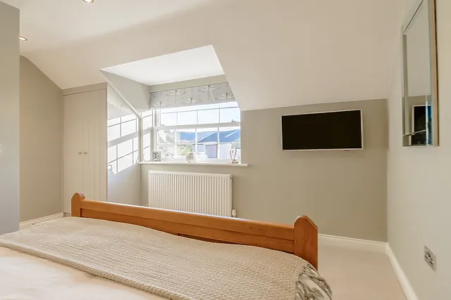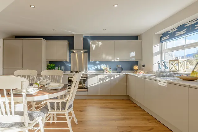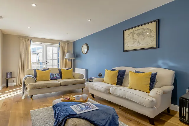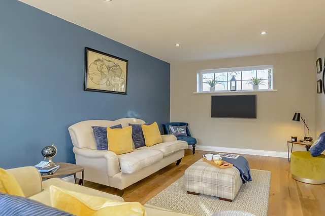 The open-plan living space is a haven for socialising, complete with a Smart TV and a stylish kitchen equipped for culinary adventures.