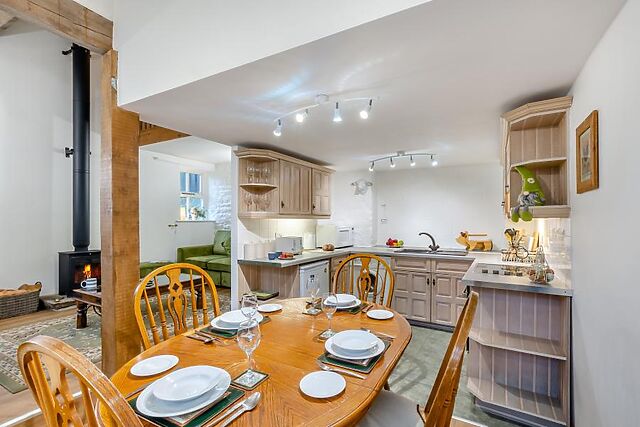 One step up from here, the living room has a choice of comfortable sofas and a TV. Light the wood burner for added ambience after dark; exposed timbers bring more warm tones to this open-plan area.
