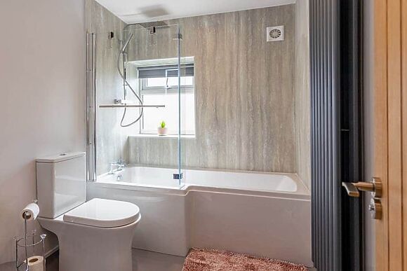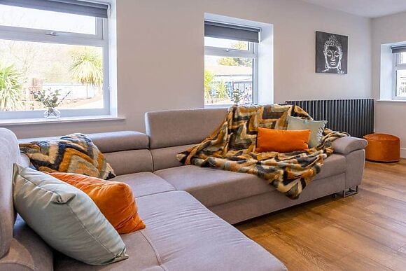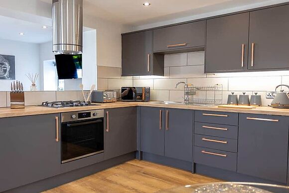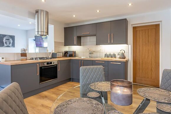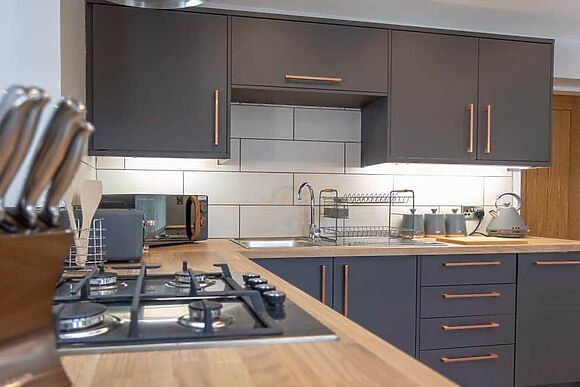 Open plan living space with corner sofa, Smart TV, fully equipped kitchen with gas hob, electric oven, dishwasher and fridge/freezer. Modern bathroom with bath and rainforest shower.
