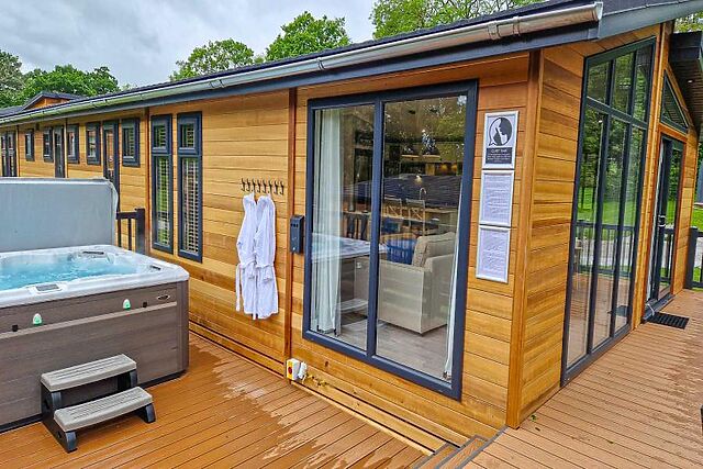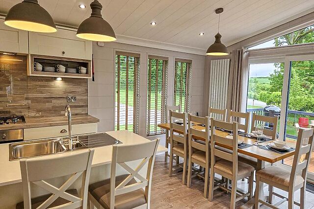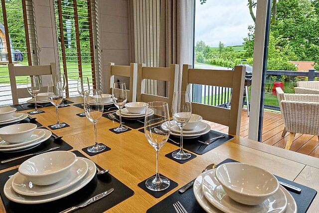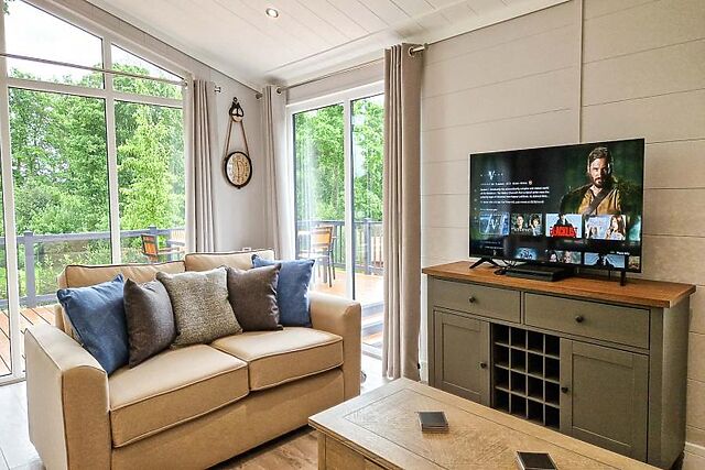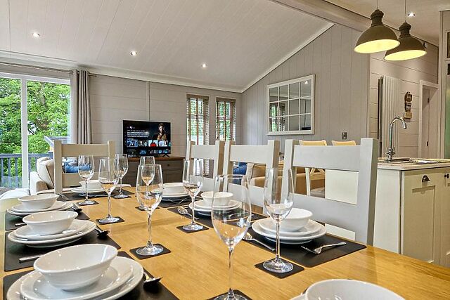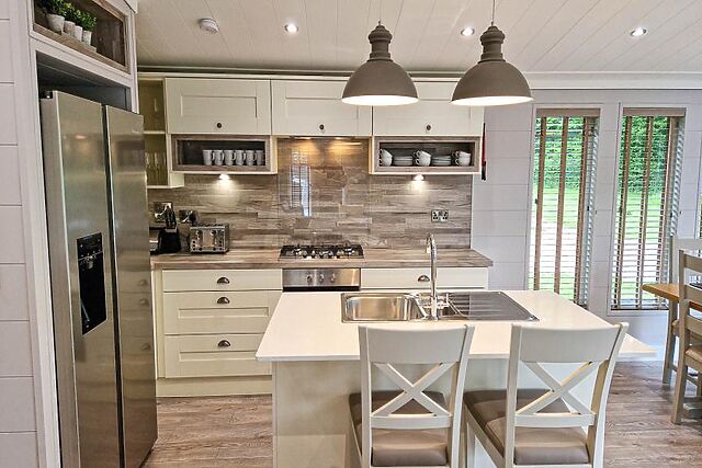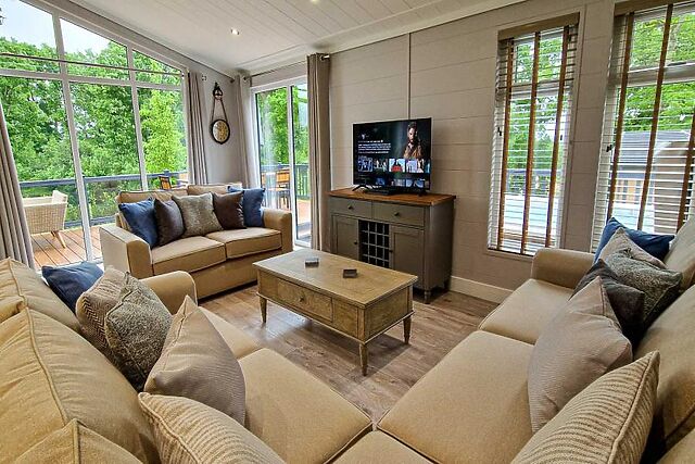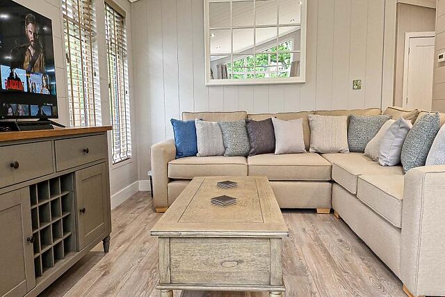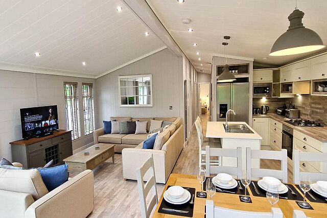 Plus, sofas are arranged before a Smart TV in the lounge area, and the shaker-style kitchen caters to all your entertaining needs, with its accessories including a fridge/freezer and an island unit that houses a dishwasher and wine cooler. Bar-style seating on one side of the island is ideal for informal snacks and chatter as dinner cooks; when you’re ready to eat more formally, the dining suite is conveniently close by.