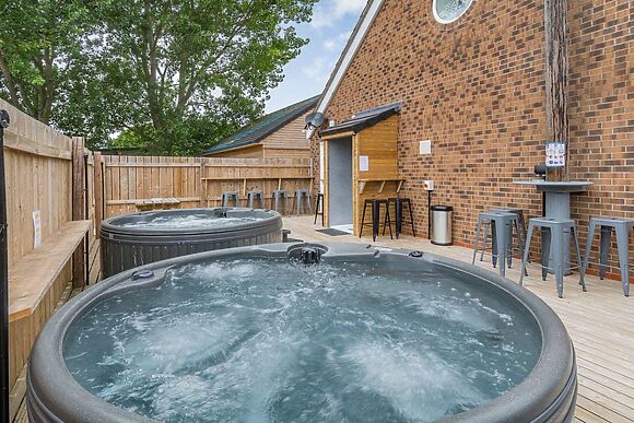 Two hot tubs on the large side decking with outdoor speakers perfect for groups of up to 12 at a time.