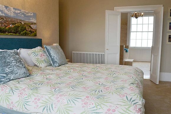 The house sleeps 10 across five bedrooms. Bedroom 2 (first floor) has a super-kingsize 6ft bed with an original tiled fireplace and a full en-suite with raised bath and walk-in shower.
