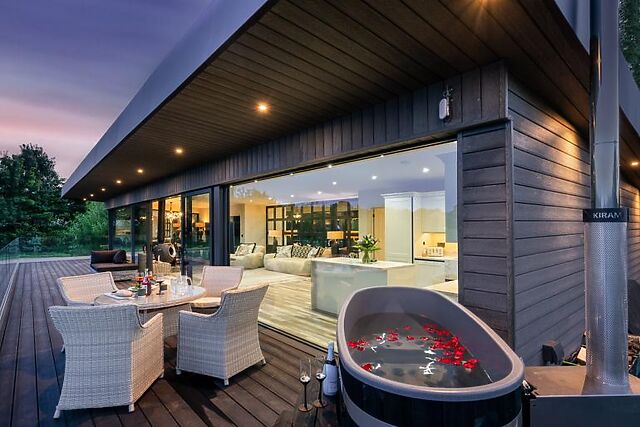 Inside, the lodge boasts a thoughtful open-plan design with a plush lounge, a high-tech kitchen, and an intimate dining area – all enhanced by soothing lighting and cosy comfort. The lodge’s two super-king-size bedrooms, each with wood-panelled walls and luxurious en-suite shower rooms, ensure a restful experience.