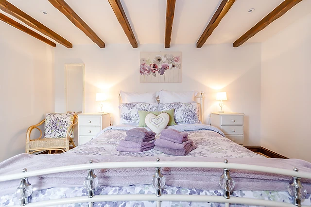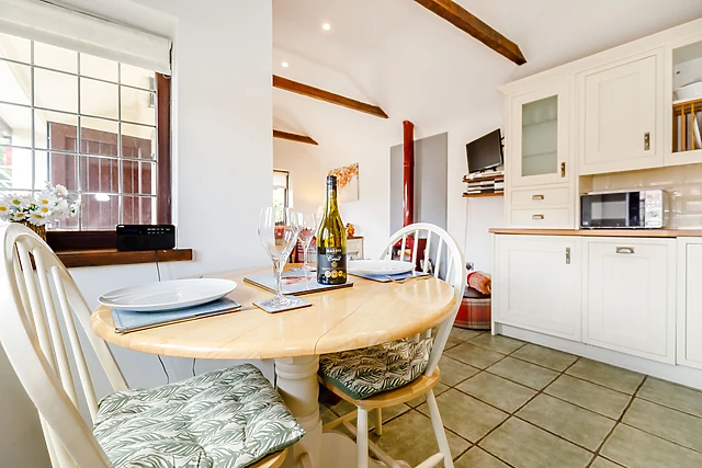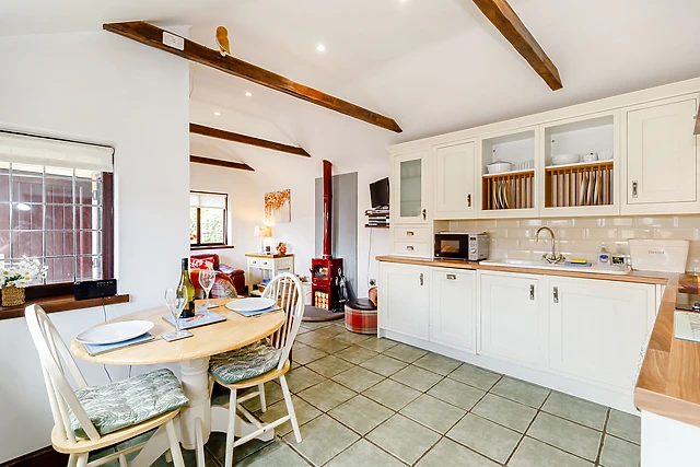 Offering a bright and cheerful open plan living area with exposed timbers, there is a well-equipped modern kitchen, a dining table and comfortable seating set around a cosy woodburner. Furnished to a high standard throughout, the pretty bedroom leads off from the sitting area and the fully-tiled shower room has a large overhead shower.