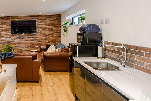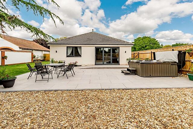 The open-plan living area, complete with a Smart TV and cosy sofas, opens onto a spacious garden, perfect for al fresco dining and unwinding in the private hot tub under the stars.