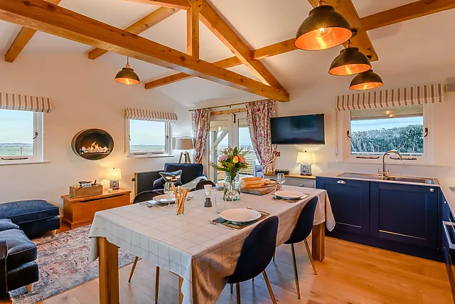 The lodge boasts an open-plan living space with a modern kitchen, where you can cook up a storm while enjoying the DAB radio.