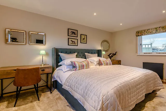 The lodge has two bedrooms: one super-king-size room and a second bedroom with a single bed that has a full-size trundle underneath, suitable for an additional guest.