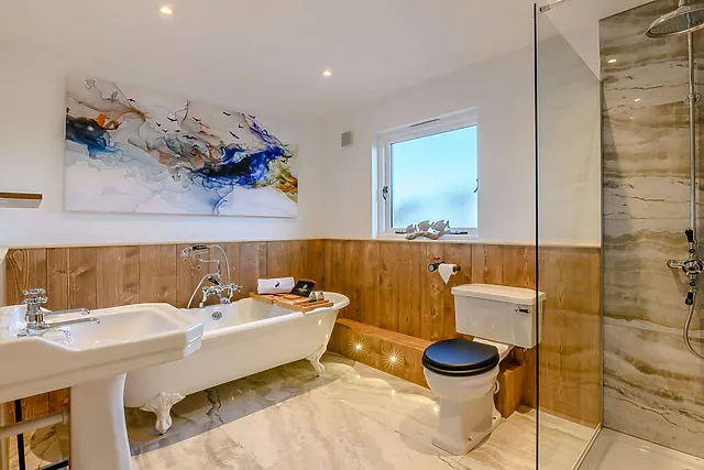 The family bathroom offers both a walk-in shower and a roll-top bath for a touch of indulgence.