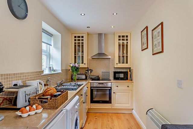 The kitchen, with its traditional charm, is fully equipped with modern appliances and all the cookware needed to prepare meals during your stay. The stylish bedroom features a plush king-size bed, ensuring a restful night’s sleep.