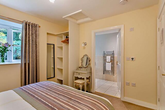 The en-suite bathroom is modern and spotless, offering a large walk-in waterfall shower, WC, and basin.
