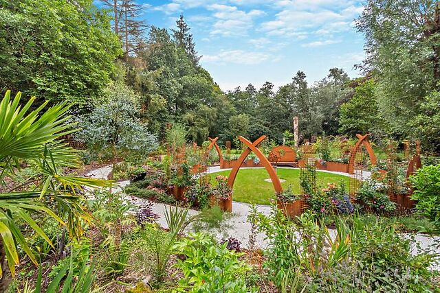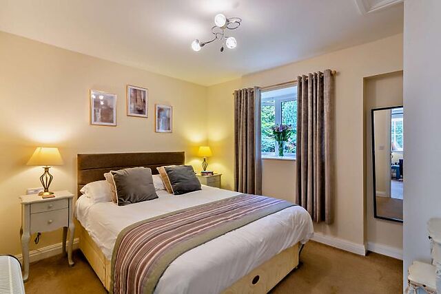 The outdoor area is the true highlight, offering six acres of landscaped gardens, a wood-fired hot tub, and a summer house equipped with a BBQ and wood burner. Various elevated decking areas provide unique views, and benches next to the flowing river offer peaceful spots to unwind.