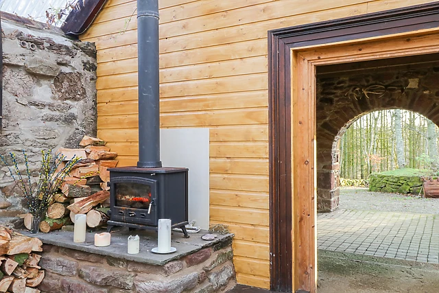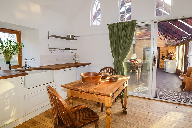 An orangery sits at the front of the property, with a vaulted ceiling, large glass windows and a decking-style floor. It is home to a cosy woodburning stove and a range of seating, including a delightful dining area where you can enjoy a romantic meal together of an evening.