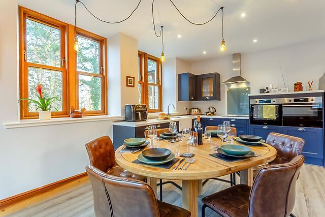 Striking modern lighting illuminates this bright and airy space, which has triple-aspect windows looking out onto the surrounding woodlands. The fabulous kitchen includes an American-style fridge/freezer, ceramic sink, and dishwasher – plus all the other kit the chef of the holiday will need to create delicious breakfasts, lunches and hearty suppers.