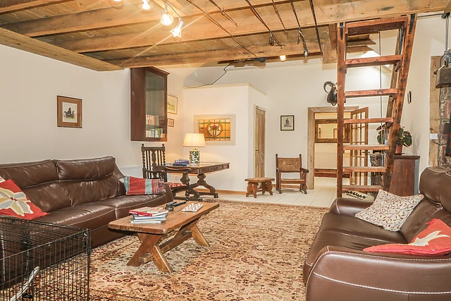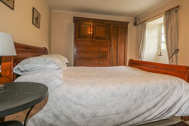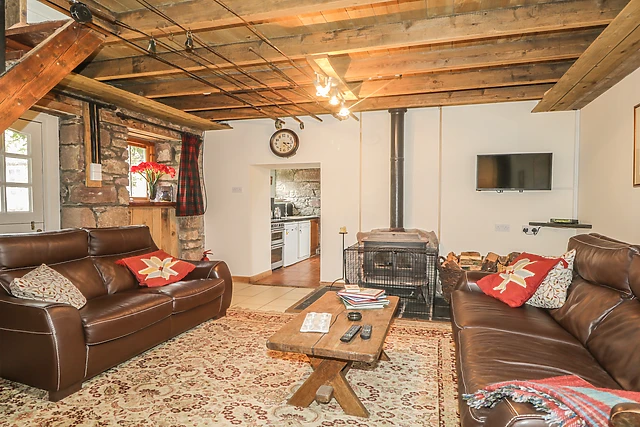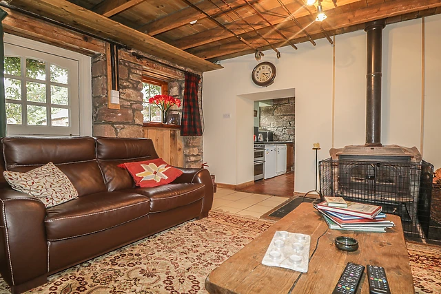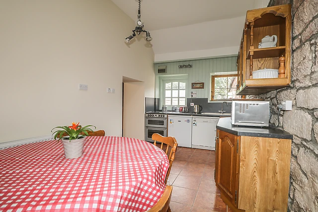 From here, a ladder leads up to an alternative sitting area or even a additional bed this mezzanine snug is an ideal space to let your hair down in peace and quiet. Next find a charming country-style kitchen/diner, well-equipped and lined with rustic wooden furnishings, as well as being enhanced by a stunning exposed stone wall.