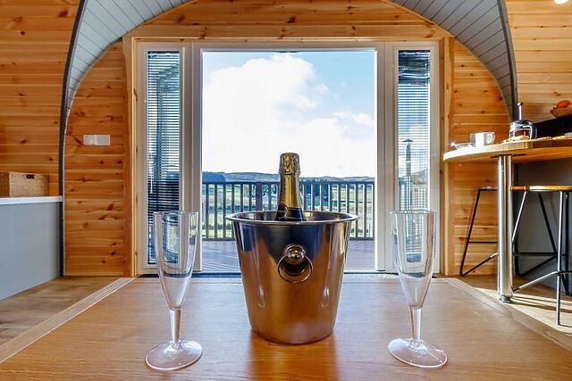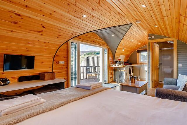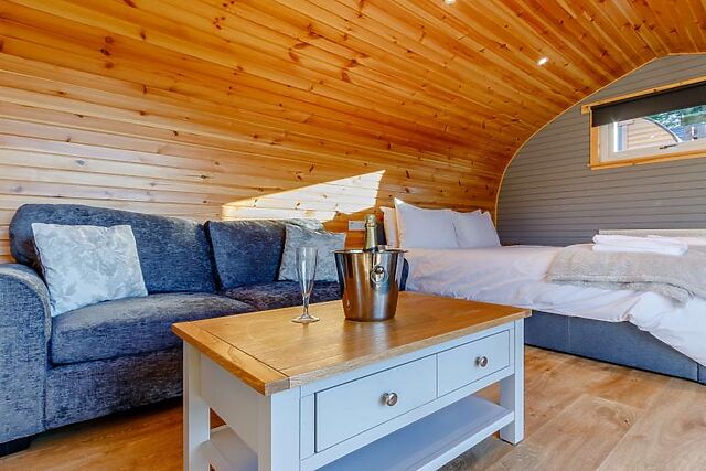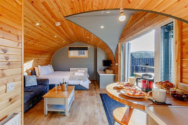Inside, you'll find a cosy open-plan living area with a bespoke kitchen, a comfortable king-size bed, and a stylish shower room.