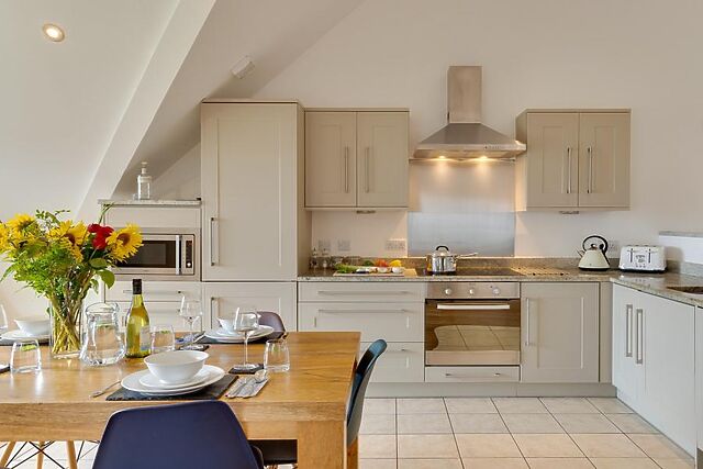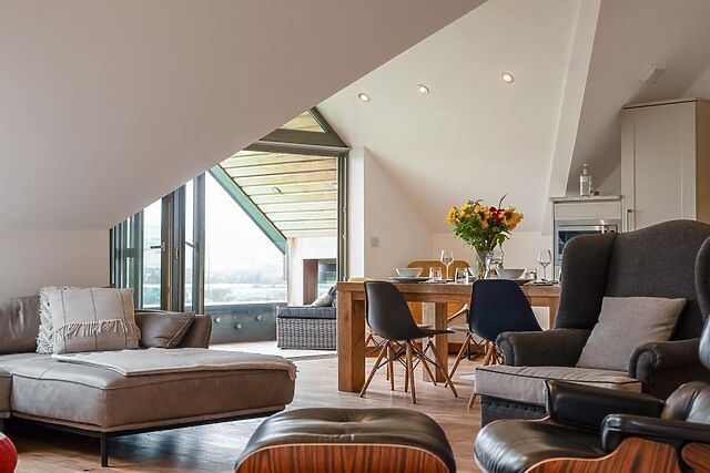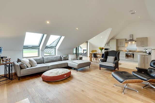 The accommodation exudes sophistication, with a glass and oak feature staircase leading to an open-plan living space bathed in natural light. The modern kitchen, elegant dining area, and integrated music system create a harmonious environment for relaxation.