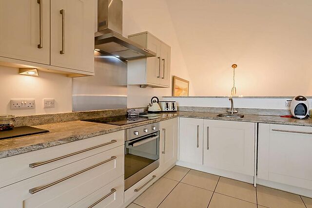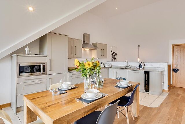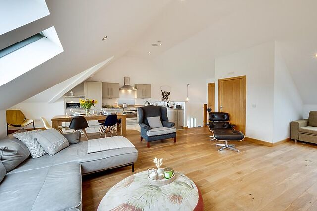 The accommodation exudes sophistication, with a glass and oak feature staircase leading to an open-plan living space bathed in natural light.