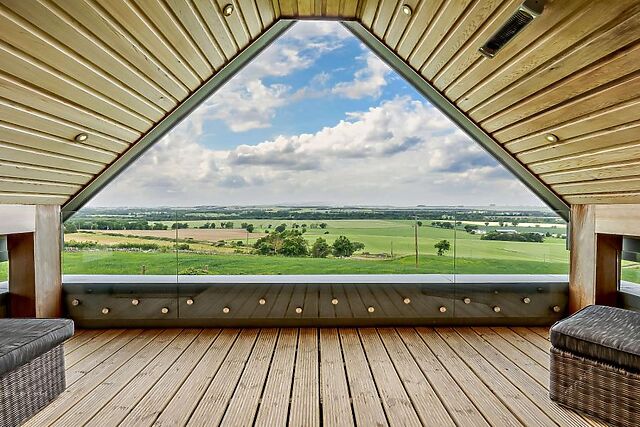 The property is designed with sophistication, featuring a heated glass-fronted balcony, a modern open-plan living space, and a hot tub for ultimate relaxation.