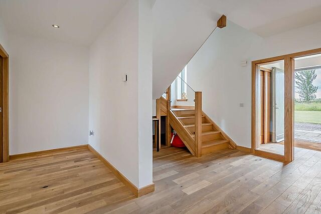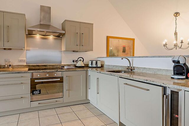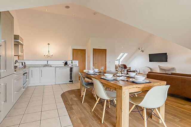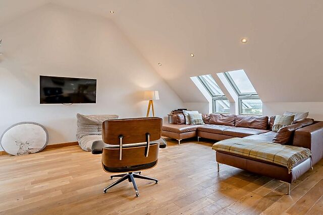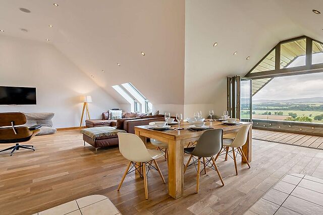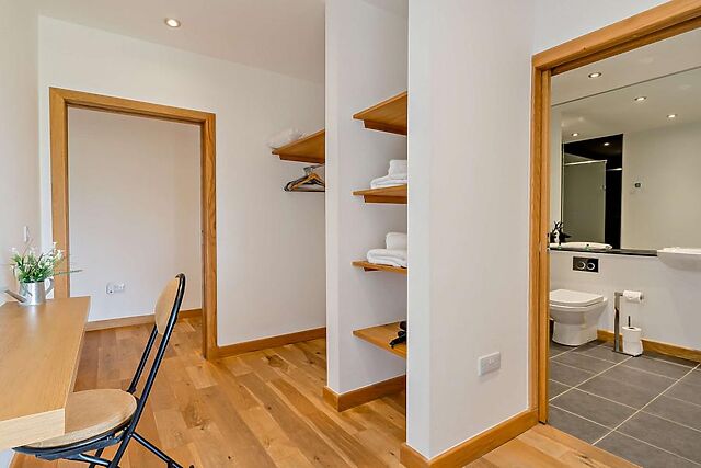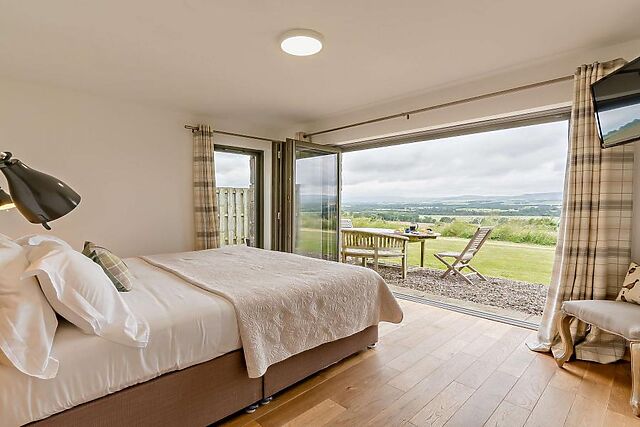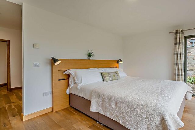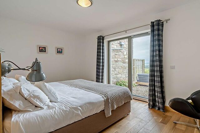 Accommodation comprises two spacious super-king en-suite bedrooms, each with bi-fold doors that open to a private garden, blending the indoor elegance with the stunning outdoor scenery.