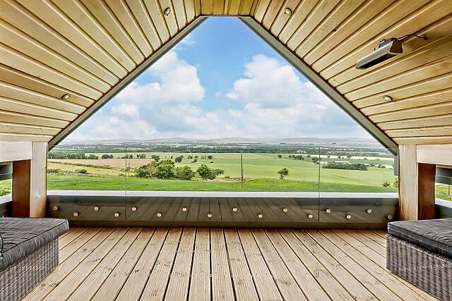 The property boasts a heated glass-fronted balcony, offering panoramic views and a perfect spot for relaxation.