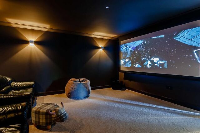Yes, there is an impressive cinema room featuring an 8-foot screen with Dolby Atmos sound, automatic blackout blinds, and a Smart TV for a true cinematic experience.