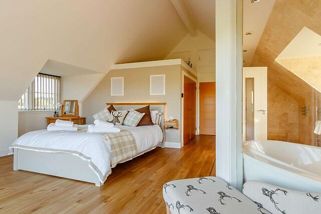 Embark on a luxurious retreat at Taigh Gleusta, a state-of-the-art 'smart house' that promises an unforgettable experience for those seeking a sophisticated countryside escape. This contemporary haven sleeps 8 guests in 4 sumptuous bedrooms, each equipped with Smart TVs and en-suite facilities, ensuring privacy and comfort.