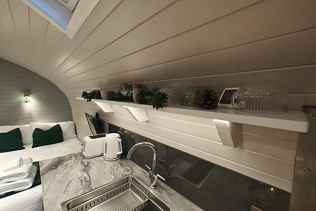Tucked away at the back of the cabin is a double bed and a shower room with a WC. And, when you want to reconnect with nature, gaze through the French doors to savour those unparalleled rolling views.