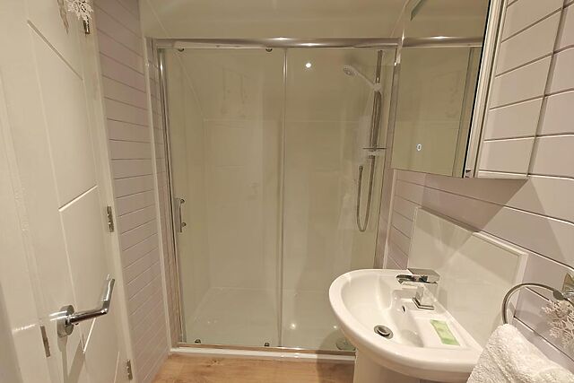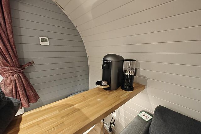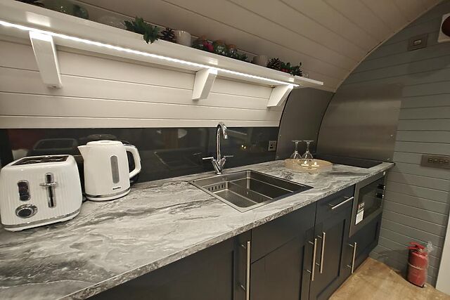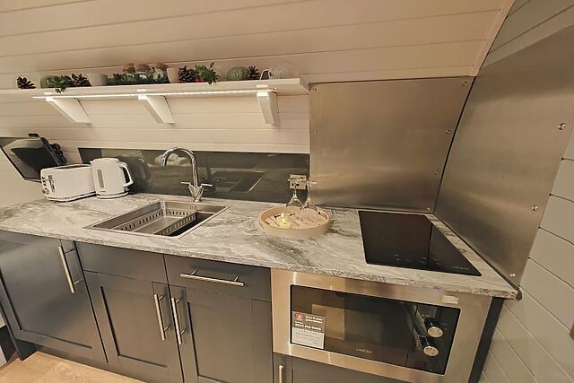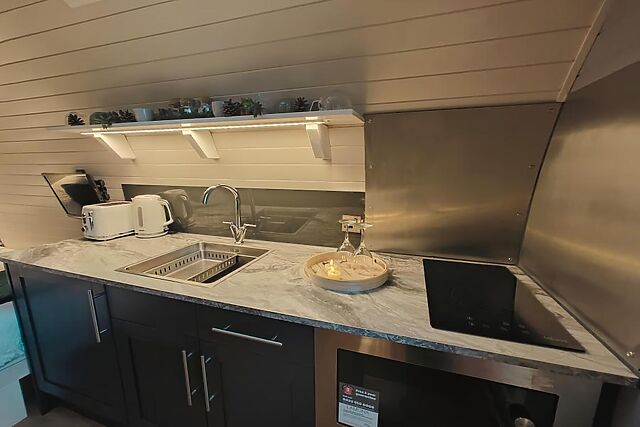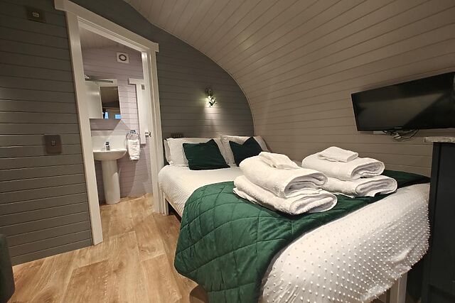 The double bed sits at the back of the lodge, as does the shower room with WC. The cabin has a private garden with a wood-fired hot tub that immerses you in the surrounding countryside.