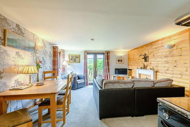 Living space - Open-plan lounge, kitchen, and dining area with a Smart TV. - Rustic decor with large patio doors framing the view.