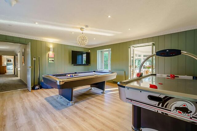 The ground floor of the property consists of a grand dining room with a built-in Sonos surround sound system and an impressive dining table with comfortable chairs, perfect for family gatherings. Get competitive in the fantastic games room with a pool table, air hockey, built-in Sonos system, and Smart TV with soundbar.
