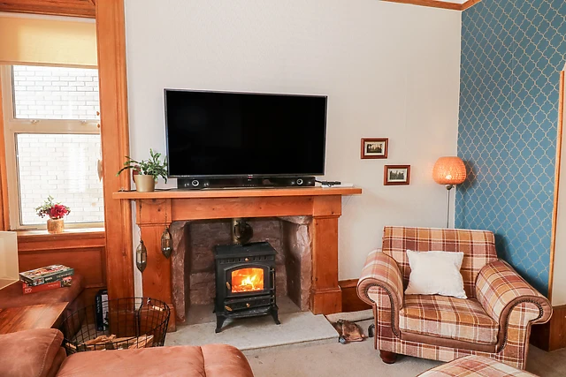 Enter into a lovely open-plan living space, offering informal dining, a sitting area with the added ambience of a woodburning stove, a Smart TV for movie marathons, and a well-fitted kitchen to cater to your culinary needs. With massive windows drawing in seas of natural light, enjoy a heart-warming meal in the dining room, punctuated by an ornamental fireplace and indoor plants.