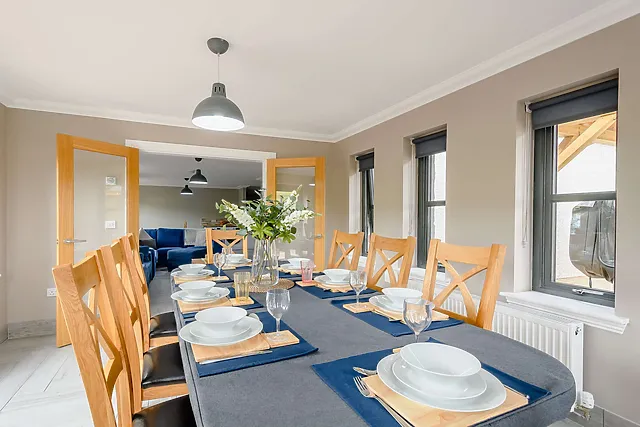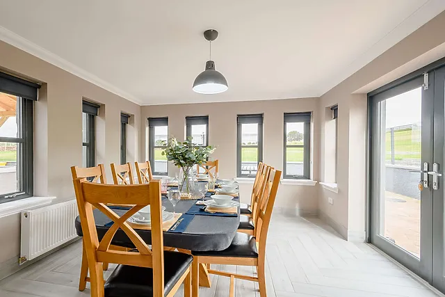 Indulge in the comfort of this lodge, featuring a spacious open-plan living area with a smart TV for your entertainment and a fully equipped kitchen for crafting delicious meals. The dining area, with its large table and French doors, opens onto an enclosed patio, perfect for alfresco dining.