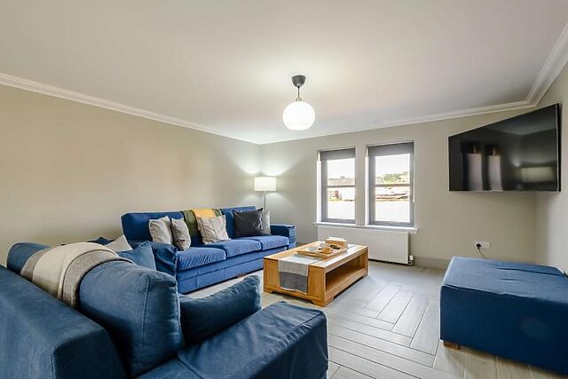The accommodation comfortably sleeps 6 guests across three bedrooms, with additional space for 2 more on a sofa bed in the lounge, making it suitable for families or groups.