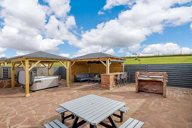 Relax in the spacious open-plan lounge and kitchen, perfect for family gatherings, or step outside to the private patio area with a gazebo, seating, and a charcoal BBQ. The highlight of your stay is sure to be the indulgent hot tub, inviting you to unwind after a day of adventure.