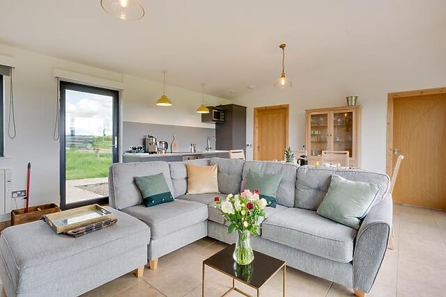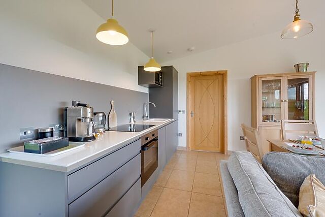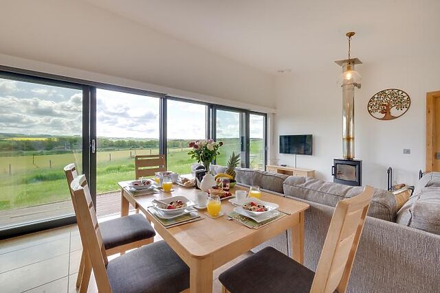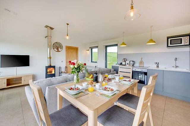Step inside to find a beautifully designed open-plan lounge and dining area with high ceilings and wall-to-wall glass doors. These doors allow for seamless indoor-outdoor living and offer breathtaking countryside views. The contemporary wood burner adds a cosy touch for those chilly nights.