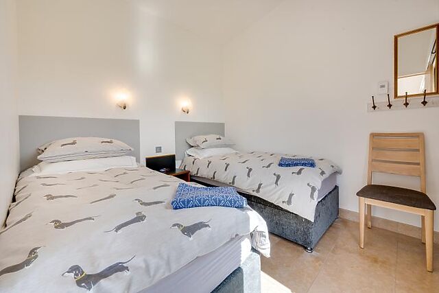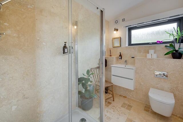 These doors allow for seamless indoor-outdoor living and offer breathtaking countryside views. The contemporary wood burner adds a cosy touch for those chilly nights.