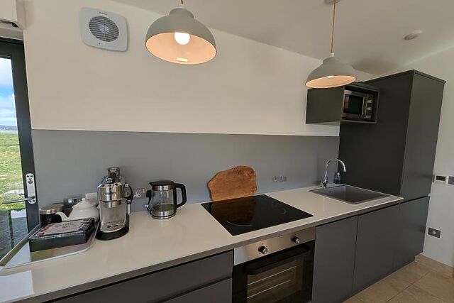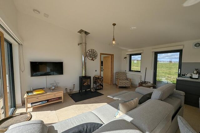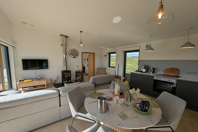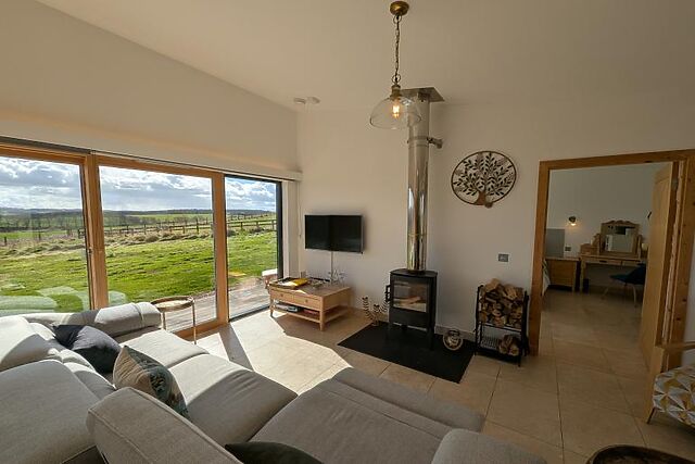 Inside, you’ll find a well-equipped kitchen with everything you need to cater, a farmhouse-style dining table, and a comfy corner sofa surrounding a TV and a wood burner.
