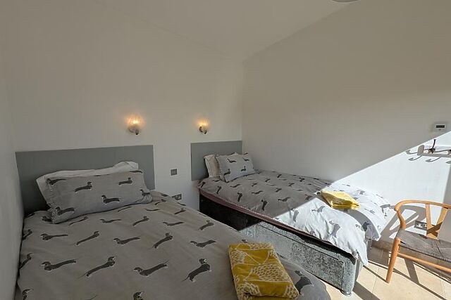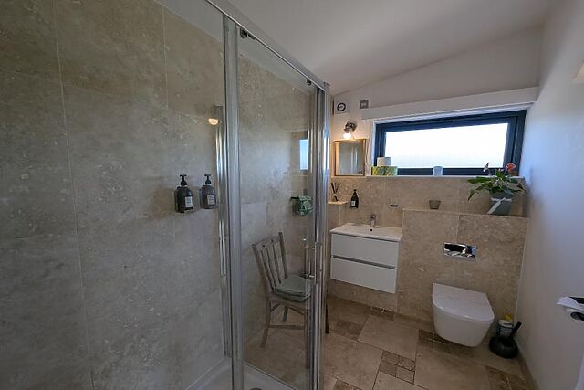 Inside, you’ll find a well-equipped kitchen with everything you need to cater, a farmhouse-style dining table, and a comfy corner sofa surrounding a TV and a wood burner. The chalet includes two generous bedrooms—one king-size and one twin—both with patio doors that frame the beautiful organic surroundings. A fully tiled contemporary bathroom completes this chic space.