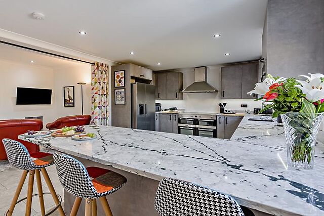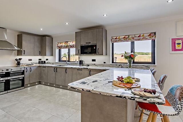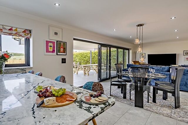 The handy breakfast bar is ideal for perching with drinks or snacks. There's also a dining space for group meals and a lounge area featuring a velvet corner sofa, excellent for watching films on the Smart TV.