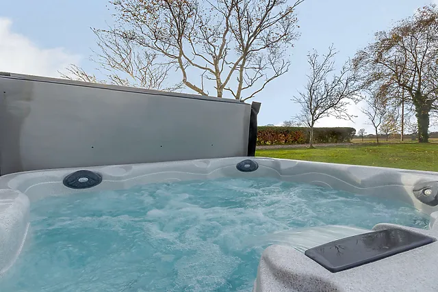 The heart of the home is a bespoke kitchen, fully equipped to cater to your culinary desires, leading to a dining area with French doors that open out to a patio featuring a private hot tub – the perfect spot for relaxation under the stars.