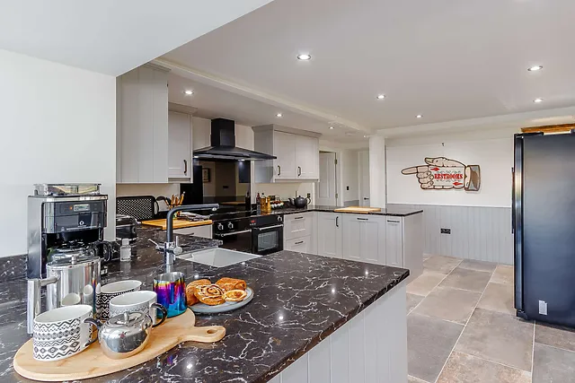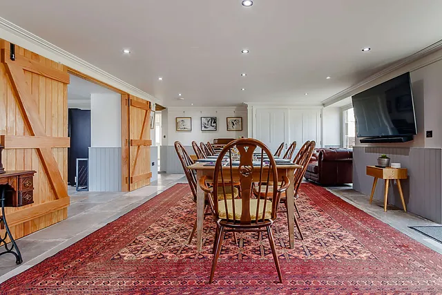 The house boasts five sumptuous super-king-size zip-and-link bedrooms, adaptable to your needs, and three well-appointed bathrooms. The heart of the home is a bespoke kitchen, fully equipped to cater to your culinary desires, leading to a dining area with French doors that open out to a patio featuring a private hot tub – the perfect spot for relaxation under the stars.