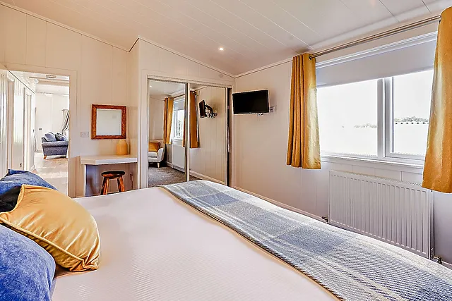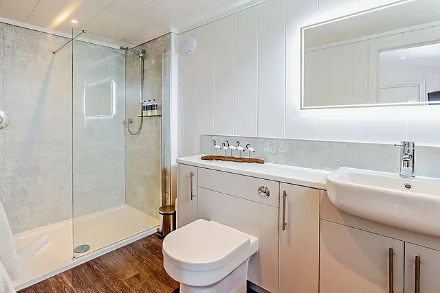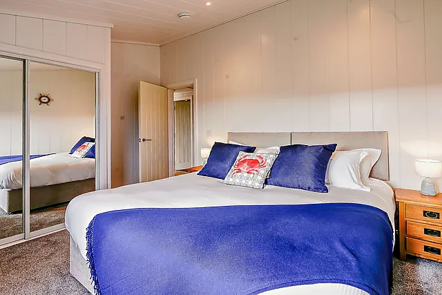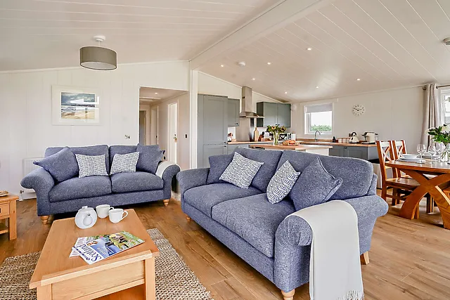 The lodge features two bedrooms, both with super-king-size zip-and-link beds that can be converted to twins. There are also two bathrooms, one with a bath and walk-in shower and another en-suite shower room.